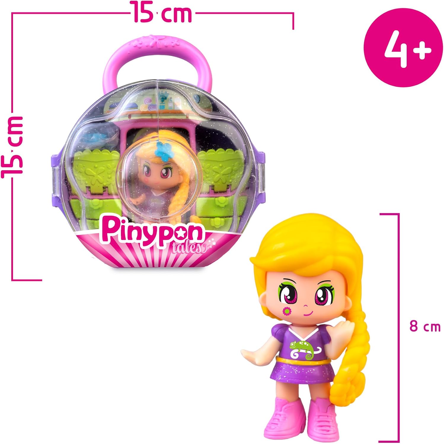 Purple bag with handle, storybook wardrobe with different compartments for storing accessories and clothes. Included inside is a story world Pinypon Rapunzel figure. Includes 3 small accessories.