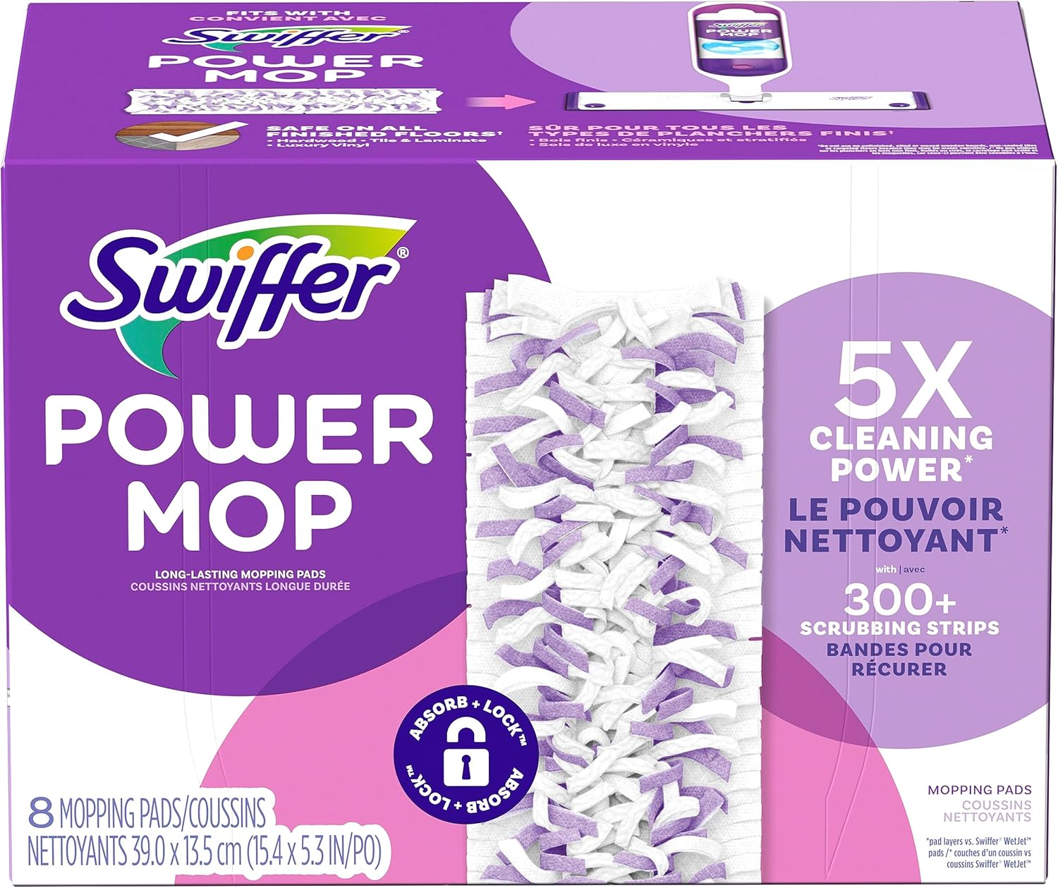 Mop smarter with the Swiffer PowerMop, an all-in-one mopping system that gives you a mop and bucket clean in half the time*. The multi-surface mopping pads have 300+ scrubbing strips that reach deep into grooves and grout to remove sticky spills and daily dirt and grime. *vs. mop and bucket – includes cleaning and drying time**Leaves behind up to 2 hours of freshness after initial product use