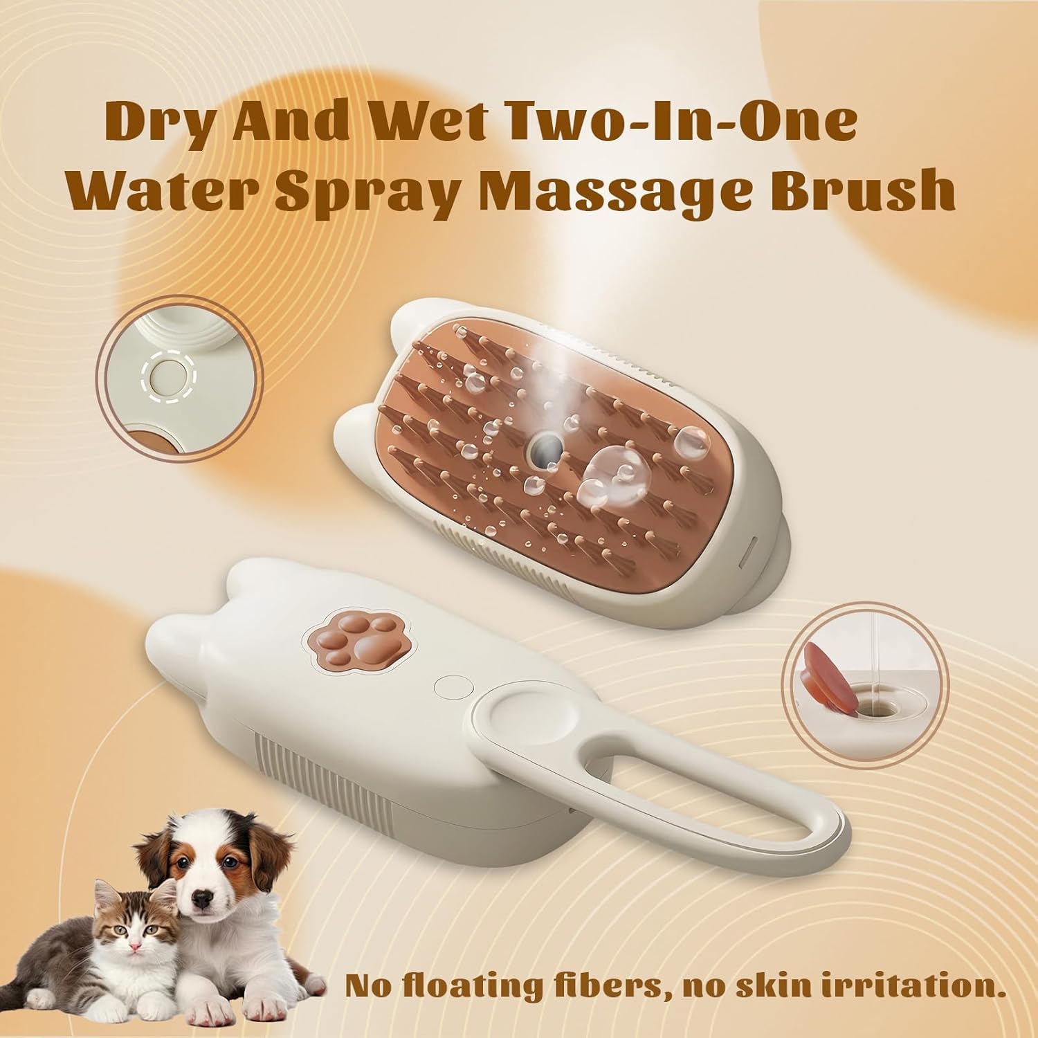 Cat Steam Brush Rechargeable Steamy Pet Grooming Brush For Dog & Cat Shedding.Specifications:Type: Steamy Cat BrushMaterial: ABS Plastic+SiliconeApplicable: long-haired/short-haired cats and dogsCapacity: 40 MLColor: Pink, Beige, Purple, WhiteDimensions: 11.5*6cm/4.52*2.36inWeight: 147gCharging Voltage: 5V/1AFunction: MassageAntistaticSoft MaterialsReduces Hair FallRemoves Dirt & DebrisKeeps Coat Shiny & SoftPromotes Blood CirculationEasy To Use1. Charge The Battery2. Add Warm Water3. Press The Button4. Apply to Your Pet's FurKindly NotedCharge time: About 30 minutesUsage time: About 35 minutesAuto Off: 5 minute spray auto pauseCharging (out of power) status: Red light is displayedFully charged: The red light will automatically turn offPackage Includes:1 X Cat Steam Brush1 X Manual1 X USB Cable