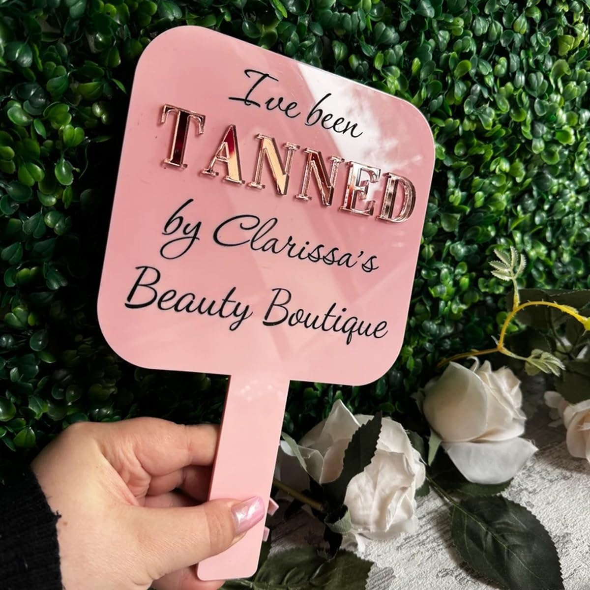 Personalized tanning handheld prop mirror, tanning technician prop mirror, custom social media propsSize: 5.9*8.7 inchesMaterial: acrylic acrylicApplicable places: beauty salon / salon decoration / tanning studio / tanning technicianPersonalized tanning prop mirrors not only enhance your brand image, but also add a professional look to every client photo, helping you strengthen your brand in a memorable way.